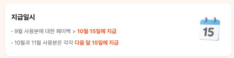 - ✅ 지급 시기: 소비월 기준 다음 달 15일부터 순차 지급