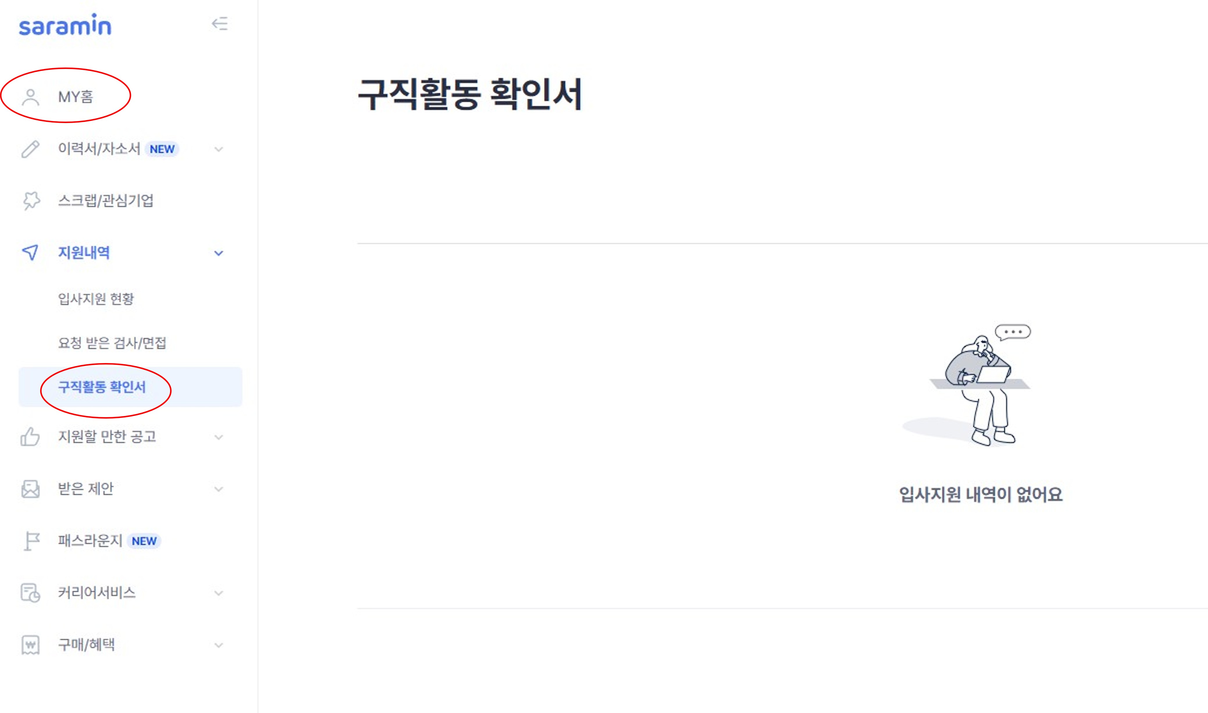 PC: 개인 홈 → 입사지원관리 → 취업활동증명서
